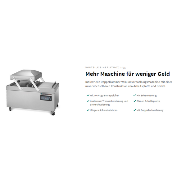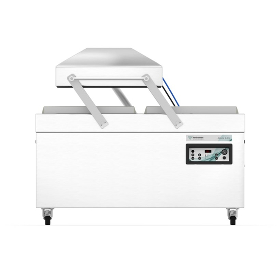 Industrielle Doppelkammer mit einer 160 m³/h-Pumpe Die Atmoz-Baureihe von Henkelman repräsentiert die gesamte Bandbreite der Ein- und Doppelkammermodelle zur Optimierung sämtlicher Vakuum-Verpackungsprozesse. Geeignet für Food-und Non-food-Anwendungen. Aufgrund der Konstruktion von Deckel und Arbeitsplatte hat Atmoz im Vergleich zu anderen Baureihen langere Schweissleisten. Robuste Atmoz 2-75Hochwertiger Lachs kann nur mit einer hochwertigen Maschine verpackt werden. Vakuumverpackung von Lachs ist eine besondere Aufgabe der Nam Co. LTD in der Provinz Binh Thuan in Vietnam die es sehr gut machen! Die Doppelkammern mit Hochleistungstechnologie werden von unserem geschätzten Distributor Seafood Equipment installiert und sind 20 Stunden am Tag mit einem hochwertigen Verpackungsergebnis in Betrieb. Das herausragende Merkmal dieser robusten Atmoz 2-75 Vakuumverpackungsmaschine ist die Konstruktion sowohl der Arbeitsplatte als auch des Deckels. Aufgrund der Konstruktion hat Atmoz im Vergleich zu anderen Baureihen längere Schweissbalken. Dieses DoppelkammerStandmodell ist standardmäβig mit einer Busch Vakuumpumpe ausgestattet und entspricht den CE-Normen. Standard mit 2 Schweissleisten (vor-hinten): 2 x 660 mm Optional ohne Aufpreis: 2 Schweissleisten (links-rechts) Standard mit Doppelschweissung (2 Drähte) Optional ohne Aufpreis:Trennschweissung/Breitschweissung (10 mm) Silikonen Behälter sind für Reinigungs- und Wartungszwecke einfach abnehmbar Pumpenkapazität: 160 m3/h Busch Vakuumpumpe Pumpenkonditionierungsprogramm für Wartung und Reinigung Maschinenzyklus: 15-40 Sek Standard Digitale Steuerung mit Zeitsteuerung und 10 Vorwahlprogramme Plane Arbeitsplatte Kommt mit 1 Lage Einlegeplatten für einen schnelleren Verarbeitungszyklus und besseren Produktplatzierung Rostfreies EdelstahlchassisKammerabmessungen (L x B x H): 760 x 660 x 280 mmMaschinenabmessungen (L x B x H): 1211 x 1545 x 1106 mmSchweissleisten (L): 2 x 660 mmPumpenkapazität: 160 m³/hMachinenzyklus: 15-40 sec OPTIONEN 1-2 Trennschweissung Sensorsteuerung Dampfsensor ACS Begasung (einschl. Druckluftverbindung) Soft-Air für optimalen Schutz von Produkt und Vakuumbeutel ZUBEHÖR (OPTIONAL GEGEN AUFPREIS) Schrägeinlage (zum Vakuum verpacken von Flüssigkeiten und Pulvern) 2e Lage Einlegeplatte Servicesatz für Standardwartung Henkelman Atmoz 2-75 Vakuumverpackungsmaschine Busch-Pumpe Alle Henkelman-Maschinen sind mit einer Busch-Vakuumpumpe ausgestattet. 3 Jahre Garantie Henkelman bietet 3 Jahre Garantie auf Ersatzteile. Atmoz-Modelle Atmoz Maschinen sind standardmässig ausgestattet mit Zeitsteuerung und 10-Programmspeicher. CE- und ETL-zertifiziert Henkelman-Maschinen entsprechen den ETL-, UL-, CSA-, NSF- und CE-Normen. Hochleistungsfähige Schweisbalken Henkelman bietet Lösungen für die Nahrungsmittelindustrie mit hohen Leistungsanforderungen. Diese Lösungen ermöglicht es bis zu 20 Stunden am Tag in Wechselschichten zu arbeiten mit zuverlässige Maschinen höchster Qualität. Zum Beispiel die intelligente Konstruktion und strapazierfähige Materialen dieser hochleistungsfähigen Schweissbalken sichern optimale Vakuumverpackungsprozesse unter extremsten Bedingungen. Doppelten Schweisskapazität Mit der doppelten Schweisskapazität durch einen extra Transformator wird eine dauerhaft perfekte Schweissung gesichert bei intensive andauernde Nutzung. Hochleistungsprozesse verlangen Hochleistungslösungen. Diese Hochleistungstechnologie ist für das Henkelman-Industrieprogramm verfügbar: Falcon, Atmoz, Polar und Titanium. Begasung Vor dem Versiegelungsschritt kann optional ein spezielles Gas oder Stickstoff eingespritzt werden. Die Vakuumierer von Henkelman können mit der Option Begasung ausgestattet werden. Beim Verpacken unter Schutzatmosphäre werden diese so genannten MAP-Gase (Modified Atmosphere Packaging) eingesetzt. Gasmischungen Das Hinzufügen von Schutzgas verlängert die Haltbarkeit, verleiht zusätzlichen Schutz und verhindert, dass sich das Produkt verfärbt. In der Regel kommt eine Mischung aus Stickstoff (N2) und Kohlendioxid (CO2) zum Einsatz. Gegebenenfalls wird dieser Mischung noch Sauerstoff (O2) hinzugefügt. ACS-Steuerung Die ACS-Steuerung von Henkelman ist mehr als nur eine Steuerung. Das Advanced Control System beinhaltet einzigartige Einstellungsmöglichkeiten, spezielle Optionen und intelligente Funktionen. Die Serien Lynx und Titaan sind serienmäßig mit Advanced Control ausgestattet. Der ACS ist als Option für Boxer, Toucan, Marlin, Falcon und Polar erhältlich. Standard ACS Eigenschaften - LCD panel - 20 Programme - USB-Schnittstelle - Standardmässige Sensorsteuerung - Druckerkompatibel - Erfüllt HACCP-Normen - Sicherer Zugang - Massgeschneiderte Software - Online programmieren Dampfsensor Wasserhaltige und flüssige Produkte wie Suppen und Saucen erreichen während des Vakuumierzyklus’ schnell den Siedepunkt. Senkt man den Kammerdruck unter den normalen Luftdruck ab, fangen Flüssigkeiten bereits bei Zimmertemperatur an zu sieden und kalte Produkte werden gekocht. Die Sensorfunktion erkennt unmittelbar und zuverlässig den aus dem flüssigen Produkt entweichenden Dampf. Signalisiert der Sensor, dass der Siedepunkt erreicht ist, stoppt die Maschine mit dem Absaugen der Luft und beginnt mit der Versiegelung des Beutels. Verwenden Sie für eine perfekte Produktplatzierung eine Schrägeinlage. Nutzen Sie diese Option, um Schäden an Ihrer Vakuumverpackungsmaschine und dem flüssigen Produkt zu vermeiden. Sensorsteuerung Mit der Sensorsteuerung ausgestattete Vakuumverpackungsmaschinen berechnen, wann der voreingestellte Prozentsatz erreicht wurde. Mit anderen Worten, das gewünschte Endvakuum wird unabhängig vom Volumen immer erreicht. Das ist der Hauptvorteil von Henkelmans Option Sensorsteuerung. Sehr praktisch zum Vakuumverpacken verschiedener Mengen und Arten von Produkten. Versiegelungssysteme Die richtige Versiegelungslösung schützt Produkte effizient vor äußeren Einflüssen