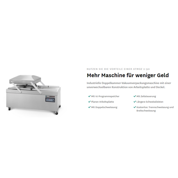 Größte Doppelkammermaschine der Atmoz-Serie mit einer 300 m³/h-Pumpe Die Atmoz-Baureihe von Henkelman repräsentiert die gesamte Bandbreite der Ein- und Doppelkammermodelle zur Optimierung sämtlicher Vakuum-Verpackungsprozesse. Geeignet für Food-und Non-food-Anwendungen. Aufgrund der Konstruktion von Deckel und Arbeitsplatte hat Atmoz im Vergleich zu anderen Baureihen langere Schweissleisten. Das herausragende Merkmal dieser robusten Atmoz 2-90 Vakuumverpackungsmaschine ist die Konstruktion sowohl der Arbeitsplatte als auch des Deckels. Aufgrund der Konstruktion hat Atmoz im Vergleich zu anderen Baureihen längere Schweissbalken. Dieses DoppelkammerStandmodell ist standardmäβig mit einer Busch Vakuumpumpe ausgestattet und entspricht den CE-Normen. Standard mit 2 Schweissleisten (vor-hinten): 2 x 880 mm Standard mit Doppelschweissung (2 Drähte) Optional ohne Aufpreis: Trennschweissung/Breitschweissung (10 mm) Silikonen Behälter sind für Reinigungs- und Wartungszwecke einfach abnehmbar Pumpenkapazität: 300 m3/h Busch Vakuumpumpe Pumpenkonditionierungsprogramm für Wartung und Reinigung Maschinenzyklus: 15-40 Sek Standard Digitale Steuerung mit Zeitsteuerung und 10 Vorwahlprogramme Plane Arbeitsplatte Kommt mit 1 Lage Einlegeplatten für einen schnelleren Verarbeitungszyklus und besseren Produktplatzierung Rostfreies EdelstahlchassisKammerabmessungen (L x B x H): 870 x 880 x 280 mmMaschinenabmessungen (L x B x H): 1320 x 1965 x 1106 mmSchweissleisten (L): 2 x 880 mmPumpenkapazität: 300 m³/hMachinenzyklus: 15-40 sec OPTIONEN 160 m3/h Busch Vakuumpumpe 1-2 Trennschweissung Sensorsteuerung Dampfsensor ACS Begasung (einschl. Druckluftverbindung) Soft-Air für optimalen Schutz von Produkt und Vakuumbeutel ZUBEHÖR (OPTIONAL GEGEN AUFPREIS) Schrägeinlage (zum Vakuum verpacken von Flüssigkeiten und Pulvern) 2e Lage Einlegeplatte Servicesatz für Standardwartung Henkelman Atmoz 2-90 Vakuumverpackungsmaschine Busch-Pumpe Alle Henkelman-Maschinen sind mit einer Busch-Vakuumpumpe ausgestattet. 3 Jahre Garantie Henkelman bietet 3 Jahre Garantie auf Ersatzteile. Atmoz-Modelle Atmoz Maschinen sind standardmässig ausgestattet mit Zeitsteuerung und 10-Programmspeicher. CE- und ETL-zertifiziert Henkelman-Maschinen entsprechen den ETL-, UL-, CSA-, NSF- und CE-Normen. Hochleistungsfähige Schweisbalken Henkelman bietet Lösungen für die Nahrungsmittelindustrie mit hohen Leistungsanforderungen. Diese Lösungen ermöglicht es bis zu 20 Stunden am Tag in Wechselschichten zu arbeiten mit zuverlässige Maschinen höchster Qualität. Zum Beispiel die intelligente Konstruktion und strapazierfähige Materialen dieser hochleistungsfähigen Schweissbalken sichern optimale Vakuumverpackungsprozesse unter extremsten Bedingungen. Doppelten Schweisskapazität Mit der doppelten Schweisskapazität durch einen extra Transformator wird eine dauerhaft perfekte Schweissung gesichert bei intensive andauernde Nutzung. Hochleistungsprozesse verlangen Hochleistungslösungen. Diese Hochleistungstechnologie ist für das Henkelman-Industrieprogramm verfügbar: Falcon, Atmoz, Polar und Titanium. Begasung Vor dem Versiegelungsschritt kann optional ein spezielles Gas oder Stickstoff eingespritzt werden. Die Vakuumierer von Henkelman können mit der Option Begasung ausgestattet werden. Beim Verpacken unter Schutzatmosphäre werden diese so genannten MAP-Gase (Modified Atmosphere Packaging) eingesetzt. Gasmischungen Das Hinzufügen von Schutzgas verlängert die Haltbarkeit, verleiht zusätzlichen Schutz und verhindert, dass sich das Produkt verfärbt. In der Regel kommt eine Mischung aus Stickstoff (N2) und Kohlendioxid (CO2) zum Einsatz. Gegebenenfalls wird dieser Mischung noch Sauerstoff (O2) hinzugefügt. ACS-Steuerung Die ACS-Steuerung von Henkelman ist mehr als nur eine Steuerung. Das Advanced Control System beinhaltet einzigartige Einstellungsmöglichkeiten, spezielle Optionen und intelligente Funktionen. Die Serien Lynx und Titaan sind serienmäßig mit Advanced Control ausgestattet. Der ACS ist als Option für Boxer, Toucan, Marlin, Falcon und Polar erhältlich. Standard ACS Eigenschaften - LCD panel - 20 Programme - USB-Schnittstelle - Standardmässige Sensorsteuerung - Druckerkompatibel - Erfüllt HACCP-Normen - Sicherer Zugang - Massgeschneiderte Software - Online programmieren Dampfsensor Wasserhaltige und flüssige Produkte wie Suppen und Saucen erreichen während des Vakuumierzyklus’ schnell den Siedepunkt. Senkt man den Kammerdruck unter den normalen Luftdruck ab, fangen Flüssigkeiten bereits bei Zimmertemperatur an zu sieden und kalte Produkte werden gekocht. Die Sensorfunktion erkennt unmittelbar und zuverlässig den aus dem flüssigen Produkt entweichenden Dampf. Signalisiert der Sensor, dass der Siedepunkt erreicht ist, stoppt die Maschine mit dem Absaugen der Luft und beginnt mit der Versiegelung des Beutels. Verwenden Sie für eine perfekte Produktplatzierung eine Schrägeinlage. Nutzen Sie diese Option, um Schäden an Ihrer Vakuumverpackungsmaschine und dem flüssigen Produkt zu vermeiden. Sensorsteuerung Mit der Sensorsteuerung ausgestattete Vakuumverpackungsmaschinen berechnen, wann der voreingestellte Prozentsatz erreicht wurde. Mit anderen Worten, das gewünschte Endvakuum wird unabhängig vom Volumen immer erreicht. Das ist der Hauptvorteil von Henkelmans Option Sensorsteuerung. Sehr praktisch zum Vakuumverpacken verschiedener Mengen und Arten von Produkten. Versiegelungssysteme Die richtige Versiegelungslösung schützt Produkte effizient vor äußeren Einflüssen. Henkelman bietet verschiedene Versiegelungssysteme für Ihre spezifische Anwendung an. Dies hängt vom Typ des Vakuumbeutels (PA / PE, Schrumpfbeutel, Beutel mit Aluminiumbeschichtung), der Dicke des Beutels, der gewünschten Versiegelung und anderen Anforderungen ab. Etikettendrucker Wesentliche Verpackungsdetails, wie Name des Produkts, Verpackung und Haltbarkeitsdatum sowie Lagertemperatur, werden während des Vakuumverpackungszy