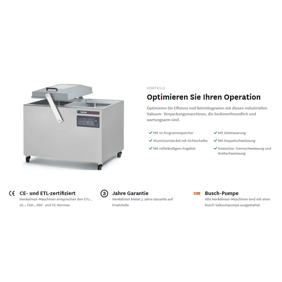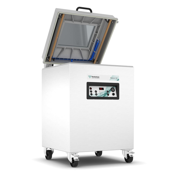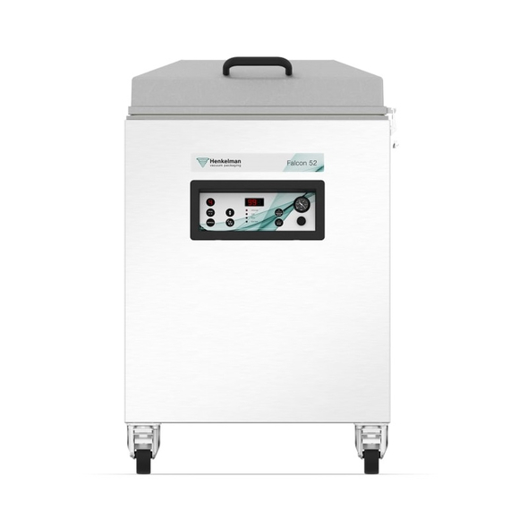 Industrielle Einkammer-Vakuumverpackungsmaschine Alle Henkelman Falcon-Modelle sind mit einer Aluminiumvakuumkammer und einem Aluminiumdeckel ausgestattet. Darüber hinaus verfügt der Deckel über ein Sichtscheibe zur Überwachung des Verpackungszyklus. Die robuste Falcon 52 Vakuumverpackungsmaschine mit Aluminiumkammer und –deckel ist standardmäßig mit zwei Schweissleisten, einer Busch Vakuumpumpe und einer Digitalen Steuerung mit 10 Vorwahlprogramme ausgestattet. Dieses Standmodell entspricht den CE-Normen. Standard mit 2 Schweissleisten (links-rechts): 2 x 520 mm Standard mit Doppelschweissung (2 Drähte). Optional (ohne Aufpreis): Trenn-/Breitschweissung Silikonhalterungen sind für Reinigungs- und Wartungszwecke einfach abnehmbar Pumpenkapazität: 63 m3/h Busch Vakuumpumpe Pumpenkonditionierungsprogramm für Wartung und Reinigung Maschinenzyklus: 15-40 Sek Standard Digitale Steuerung mit Zeitsteuerung und 10 Vorwahlprogramme Rostfreies Edelstahlchassis und Aluminiumkammer und –deckel mit Sichtfenster Kommt mit Einlegeplatten für einen schnelleren Verarbeitungszyklus und besseren ProduktplatzierungKammerabmessungen (L x B x H): 520 x 500 x 235 mmMaschinenabmessungen (L x B x H): 695 x 682x 1060 mmSchweissleisten (L): 2 x 520 mmPumpenkapazität: 63 m³/hMachinenzyklus: 15-40 sec OPTIONEN 1-2 Trennschweissung Bi-aktiv-Schweissung Soft-Air für optimalen Schutz von Produkt und Vakuumbeutel Sensorsteuerung/ACS-Steuerung Dampfsensor Begasung ZUBEHÖR (OPTIONAL GEGEN AUFPREIS) Zebra ZD410 Thermo-Etikettendrucker (nur für Maschinen mit ACS-Steuerung verfügbar) Schrägeinlage (zum Vakuum verpacken von Flüssigkeiten und Pulvern) Servicesatz für Standardwartung Henkelman Falcon 52 Vakuumverpackungsmaschine Busch-Pumpe Alle Henkelman-Maschinen sind mit einer Busch-Vakuumpumpe ausgestattet. 3 Jahre Garantie Henkelman bietet 3 Jahre Garantie auf Ersatzteile. Falcon-Modelle Alle Henkelman Falcon-Modelle sind mit einer Aluminiumvakuumkammer und einem Aluminiumdeckel ausgestattet. CE- und ETL-zertifiziert Henkelman-Maschinen entsprechen den ETL-, UL-, CSA-, NSF- und CE-Normen. Hochleistungsfähige Schweisbalken Henkelman bietet Lösungen für die Nahrungsmittelindustrie mit hohen Leistungsanforderungen. Diese Lösungen ermöglicht es bis zu 20 Stunden am Tag in Wechselschichten zu arbeiten mit zuverlässige Maschinen höchster Qualität. Zum Beispiel die intelligente Konstruktion und strapazierfähige Materialen dieser hochleistungsfähigen Schweissbalken sichern optimale Vakuumverpackungsprozesse unter extremsten Bedingungen. Doppelten Schweisskapazität Mit der doppelten Schweisskapazität durch einen extra Transformator wird eine dauerhaft perfekte Schweissung gesichert bei intensive andauernde Nutzung. Hochleistungsprozesse verlangen Hochleistungslösungen. Diese Hochleistungstechnologie ist für das Henkelman-Industrieprogramm verfügbar: Falcon, Atmoz, Polar und Titanium. Begasung Vor dem Versiegelungsschritt kann optional ein spezielles Gas oder Stickstoff eingespritzt werden. Die Vakuumierer von Henkelman können mit der Option Begasung ausgestattet werden. Beim Verpacken unter Schutzatmosphäre werden diese so genannten MAP-Gase (Modified Atmosphere Packaging) eingesetzt. Gasmischungen Das Hinzufügen von Schutzgas verlängert die Haltbarkeit, verleiht zusätzlichen Schutz und verhindert, dass sich das Produkt verfärbt. In der Regel kommt eine Mischung aus Stickstoff (N2) und Kohlendioxid (CO2) zum Einsatz. Gegebenenfalls wird dieser Mischung noch Sauerstoff (O2) hinzugefügt. ACS-Steuerung Die ACS-Steuerung von Henkelman ist mehr als nur eine Steuerung. Das Advanced Control System beinhaltet einzigartige Einstellungsmöglichkeiten, spezielle Optionen und intelligente Funktionen. Die Serien Lynx und Titaan sind serienmäßig mit Advanced Control ausgestattet. Der ACS ist als Option für Boxer, Toucan, Marlin, Falcon und Polar erhältlich. Standard ACS Eigenschaften - LCD panel - 20 Programme - USB-Schnittstelle - Standardmässige Sensorsteuerung - Druckerkompatibel - Erfüllt HACCP-Normen - Sicherer Zugang - Massgeschneiderte Software - Online programmieren Dampfsensor Wasserhaltige und flüssige Produkte wie Suppen und Saucen erreichen während des Vakuumierzyklus’ schnell den Siedepunkt. Senkt man den Kammerdruck unter den normalen Luftdruck ab, fangen Flüssigkeiten bereits bei Zimmertemperatur an zu sieden und kalte Produkte werden gekocht. Die Sensorfunktion erkennt unmittelbar und zuverlässig den aus dem flüssigen Produkt entweichenden Dampf. Signalisiert der Sensor, dass der Siedepunkt erreicht ist, stoppt die Maschine mit dem Absaugen der Luft und beginnt mit der Versiegelung des Beutels. Verwenden Sie für eine perfekte Produktplatzierung eine Schrägeinlage. Nutzen Sie diese Option, um Schäden an Ihrer Vakuumverpackungsmaschine und dem flüssigen Produkt zu vermeiden. Sensorsteuerung Mit der Sensorsteuerung ausgestattete Vakuumverpackungsmaschinen berechnen, wann der voreingestellte Prozentsatz erreicht wurde. Mit anderen Worten, das gewünschte Endvakuum wird unabhängig vom Volumen immer erreicht. Das ist der Hauptvorteil von Henkelmans Option Sensorsteuerung. Sehr praktisch zum Vakuumverpacken verschiedener Mengen und Arten von Produkten. Versiegelungssysteme Die richtige Versiegelungslösung schützt Produkte effizient vor äußeren Einflüssen. Henkelman bietet verschiedene Versiegelungssysteme für Ihre spezifische Anwendung an. Dies hängt vom Typ des Vakuumbeutels (PA / PE, Schrumpfbeutel, Beutel mit Aluminiumbeschichtung), der Dicke des Beutels, der gewünschten Versiegelung und anderen Anforderungen ab. Etikettendrucker Wesentliche Verpackungsdetails, wie Name des Produkts, Verpackung und Haltbarkeitsdatum sowie Lagertemperatur, werden während des Vakuumverpackungszyklus automatisch gedruckt. Ein Thermo-Etikettendrucker bietet viele Vorteile für jeden Vakuumverpackungsprozess. Hochleistungs-Pumpe Busch 360 m³/h. Vakuumpumpe. Diese Busch-Innovation in