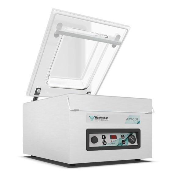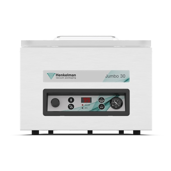 Kompakte Vakuumverpackungsmaschine für ein professionelles Ergebnis. Die robuste Jumbo 30 Vakuumverpackungsmaschine aus Edelstahl ist standardmäßig mit einer Busch Vakuumpumpe und einer Zeitsteuerung mit 1 Vorwahlprogramm ausgestattet. Dieses Tischmodell entspricht den CE-Normen. Standard mit 1 Schweissleiste (vor): 350 mmStandard mit Doppelschweissung (2 Drähte). Optional (ohne Aufpreis): Trenn-/BreitschweissungSchweissleiste ist für Reinigungs- und Wartungszwecke einfach abnehmbarPumpenkapazität: 8 m3/h Busch VakuumpumpePumpenkonditionierungsprogramm für Wartung und ReinigungMaschinenzyklus: 25-60 SekStandard Zeitsteuerung mit 1 VorwahlprogrammTiefgezogene, rostfreie EdelstahlkammerRostfreies Edelstahlchassis und transparanter DeckelKommt mit Einlegeplatte für einen schnelleren Verarbeitungszyklus und bessere ProduktplatzierungKammerabmessungen (L x B x H): 370 x 350 x 150 mmMaschinenabmessungen (L x B x H): 554 x 450 x 365 mmSchweissleiste (L): 350 mmPumpenkapazität: 8 m³/hMachinenzyklus: 25-60 sec Henkelman Jumbo 30 Vakuumverpackungsmaschine Busch-Pumpe Alle Henkelman-Maschinen sind mit einer Busch-Vakuumpumpe ausgestattet. 3 Jahre Garantie Henkelman bietet 3 Jahre Garantie auf Ersatzteile. Jumbo-Modelle Alle Jumbo-Modelle sind serienmässig mit Zeitsteuerung, 1 Programmierpanel und Doppel- oder Trennschweissung ausgestattet. CE- und ETL-zertifiziert Henkelman-Maschinen entsprechen den ETL-, UL-, CSA-, NSF- und CE-Normen.