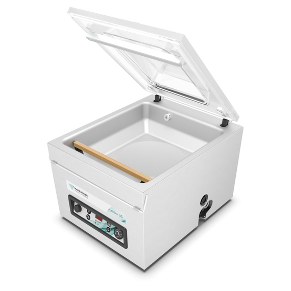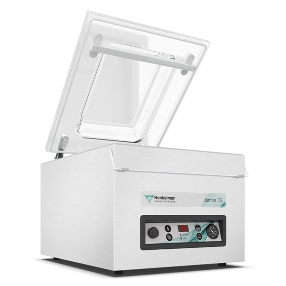 Ähnlich die Jumbo 30, jedoch mit mehr Pumpenkapazität Die robuste Jumbo 35 Vakuumverpackungsmaschine aus Edelstahl ist standardmäßig mit einer Busch Vakuumpumpe und einer Zeitsteuerung mit 1 Vorwahlprogramm ausgestattet. Dieses Tischmodell entspricht den CE-Normen. Standard mit 1 Schweissleiste (vor): 350 mmStandard mit Doppelschweissung (2 Drähte). Optional (ohne Aufpreis): Trenn- /BreitschweissungSchweissleiste ist für Reinigungs- und Wartungszwecke einfach abnehmbarPumpenkapazität: 16 m3/h Busch VakuumpumpePumpenkonditionierungsprogramm für Wartung und ReinigungMaschinenzyklus: 15-30 SekStandard Zeitsteuerung mit 1 VorwahlprogrammTiefgezogene, rostfreie EdelstahlkammerRostfreies Edelstahlchassis und transparanter DeckelKommt mit Einlegeplatte für einen schnelleren Verarbeitungszyklus und bessere ProduktplatzierungKammerabmessungen (L x B x H): 370 x 350 x 150 mmMaschinenabmessungen (L x B x H): 554 x 450 x 405 mmSchweißleiste (L): 350 mmPumpenkapazität: 16 m³/hMachinenzyklus: 15-30 sec Henkelman Jumbo 35 Vakuumverpackungsmaschine Busch-Pumpe Alle Henkelman-Maschinen sind mit einer Busch-Vakuumpumpe ausgestattet. 3 Jahre Garantie Henkelman bietet 3 Jahre Garantie auf Ersatzteile. Jumbo-Modelle Alle Jumbo-Modelle sind serienmässig mit Zeitsteuerung, 1 Programmierpanel und Doppel- oder Trennschweissung ausgestattet. CE- und ETL-zertifiziert Henkelman-Maschinen entsprechen den ETL-, UL-, CSA-, NSF- und CE-Normen.