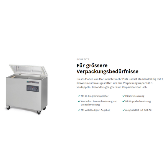 Perfekt für Fischverpackungen Die Marlin Reihe von Henkelman bietet lang anhaltende Qualität, optimale Kapazität und einen attraktiven Preis. Sensorsteuerung, ACS-Steuerung, Begasung und viele weitere Optionen sind verfügbar, um diese Vakuumverpackungsmaschinen an Ihre Verpackungsanforderungen anzupassen. Die robuste Marlin 90 Vakuumverpackungsmaschine aus Edelstahl ist standardmäßig mit zwei Schweissleisten, einer Busch Vakuumpumpe und einer Digitalen Steuerung mit 10 Vorwahlprogramme ausgestattet. Dieses Standmodell entspricht den CE-Normen. Standard mit 2 Schweissleisten (links-rechts): 2 x 320 mm Standard mit Doppelschweissung (2 Drähte). Optional (ohne Aufpreis): Trenn-/Breitschweissung Schweissleisten sind für Reinigungs- und Wartungszwecke einfach abnehmbar Pumpenkapazität: 63 m3/h Busch Vakuumpumpe Pumpenkonditionierungsprogramm für Wartung und Reinigung Maschinenzyklus: 15-40 Sek Standard Digitale Steuerung mit Zeitsteuerung und 10 Vorwahlprogramme Standard Soft-Air für optimalen Schutz von Produkt und Vakuumbeutel Tiefgezogene, rostfreie Edelstahlkammer Rostfreies Edelstahlchassis und transparanter Deckel Kommt mit Einlegeplatten für einen schnelleren Verarbeitungszyklus und besseren ProduktplatzierungKammerabmessungen (L x B x H): 320 x 890 x 100 mmMaschinenabmessungen (L x B x H): 480 x 1066 x 970 mmSchweissleisten (L): 2 x 320 mmPumpenkapazität: 63 m³/hMachinenzyklus: 15-40 sec OPTIONEN 2 Schweissleisen (links (280 mm), front (940 mm)) Sensorsteuerung ACS-Steuerung Dampfsensor Begasung ZUBEHÖR (OPTIONAL GEGEN AUFPREIS) Zebra ZD410 Thermo-Etikettendrucker (nur für Maschinen mit ACS-Steuerung verfügbar) Schrägeinlage (zum Vakuum verpacken von Flüssigkeiten und Pulvern) Servicesatz für Standardwartung Henkelman Marlin 90 Vakuumverpackungsmaschine Busch-Pumpe Alle Henkelman-Maschinen sind mit einer Busch-Vakuumpumpe ausgestattet. 3 Jahre Garantie Henkelman bietet 3 Jahre Garantie auf Ersatzteile. Marlin-Modelle Alle Marlin Modelle sind serienmässig mit Zeitsteuerung, 10 Programmierpanel und Doppelschweissung ausgestattet. CE- und ETL-zertifiziert Henkelman-Maschinen entsprechen den ETL-, UL-, CSA-, NSF- und CE-Normen. Begasung Vor dem Versiegelungsschritt kann optional ein spezielles Gas oder Stickstoff eingespritzt werden. Die Vakuumierer von Henkelman können mit der Option Begasung ausgestattet werden. Beim Verpacken unter Schutzatmosphäre werden diese so genannten MAP-Gase (Modified Atmosphere Packaging) eingesetzt. Gasmischungen Das Hinzufügen von Schutzgas verlängert die Haltbarkeit, verleiht zusätzlichen Schutz und verhindert, dass sich das Produkt verfärbt. In der Regel kommt eine Mischung aus Stickstoff (N2) und Kohlendioxid (CO2) zum Einsatz. Gegebenenfalls wird dieser Mischung noch Sauerstoff (O2) hinzugefügt. ACS-Steuerung Die ACS-Steuerung von Henkelman ist mehr als nur eine Steuerung. Das Advanced Control System beinhaltet einzigartige Einstellungsmöglichkeiten, spezielle Optionen und intelligente Funktionen. Die Serien Lynx und Titaan sind serienmäßig mit Advanced Control ausgestattet. Der ACS ist als Option für Boxer, Toucan, Marlin, Falcon und Polar erhältlich. Standard ACS Eigenschaften - LCD panel - 20 Programme - USB-Schnittstelle - Standardmässige Sensorsteuerung - Druckerkompatibel - Erfüllt HACCP-Normen - Sicherer Zugang - Massgeschneiderte Software - Online programmieren Dampfsensor Wasserhaltige und flüssige Produkte wie Suppen und Saucen erreichen während des Vakuumierzyklus’ schnell den Siedepunkt. Senkt man den Kammerdruck unter den normalen Luftdruck ab, fangen Flüssigkeiten bereits bei Zimmertemperatur an zu sieden und kalte Produkte werden gekocht. Die Sensorfunktion erkennt unmittelbar und zuverlässig den aus dem flüssigen Produkt entweichenden Dampf. Signalisiert der Sensor, dass der Siedepunkt erreicht ist, stoppt die Maschine mit dem Absaugen der Luft und beginnt mit der Versiegelung des Beutels. Verwenden Sie für eine perfekte Produktplatzierung eine Schrägeinlage. Nutzen Sie diese Option, um Schäden an Ihrer Vakuumverpackungsmaschine und dem flüssigen Produkt zu vermeiden. Sensorsteuerung Mit der Sensorsteuerung ausgestattete Vakuumverpackungsmaschinen berechnen, wann der voreingestellte Prozentsatz erreicht wurde. Mit anderen Worten, das gewünschte Endvakuum wird unabhängig vom Volumen immer erreicht. Das ist der Hauptvorteil von Henkelmans Option Sensorsteuerung. Sehr praktisch zum Vakuumverpacken verschiedener Mengen und Arten von Produkten. Versiegelungssysteme Die richtige Versiegelungslösung schützt Produkte effizient vor äußeren Einflüssen. Henkelman bietet verschiedene Versiegelungssysteme für Ihre spezifische Anwendung an. Dies hängt vom Typ des Vakuumbeutels (PA / PE, Schrumpfbeutel, Beutel mit Aluminiumbeschichtung), der Dicke des Beutels, der gewünschten Versiegelung und anderen Anforderungen ab. Etikettendrucker Wesentliche Verpackungsdetails, wie Name des Produkts, Verpackung und Haltbarkeitsdatum sowie Lagertemperatur, werden während des Vakuumverpackungszyklus automatisch gedruckt. Ein Thermo-Etikettendrucker bietet viele Vorteile für jeden Vakuumverpackungsprozess. Vakuumieren in Gastronormbehältern Mit diesem Zubehör kann in speziellen Gastronormbehältern für Lebensmittelverpackungen außerhalb der Maschine vakumiert werden. Abhängig davon, ob die Maschine Zeit oder Sensorsteuerung hat, wird der Vakuumwert in Sekunden oder % eingestellt. Es ist sehr wichtig zuerst zu prüfen, ob der Behälter für das Vakumieren geeignet ist.